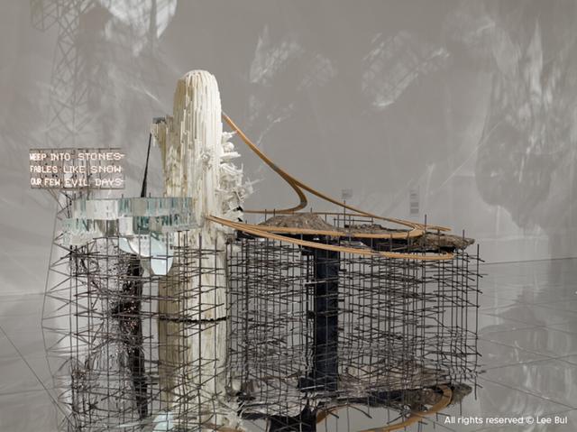 李昢,《我的宏大叙事(Mon grand récit):泣泪沾石……》,2005年,东京森美术馆“李昢:来自我,只属于你”展览现场,2012年,聚氨酯、Foamex牌PVC泡棉板、人造陶泥、不锈钢及铝棒、亚加力板、木、塑胶彩、清漆、灯、电路布线,HITEJINRO Co., Ltd. 藏,© 李昢,摄影:渡边修,图片由艺术家及森美术馆提供