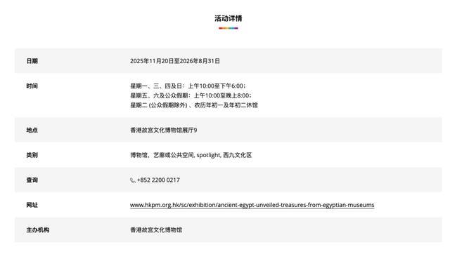 “古埃及文明大展:埃及博物馆珍藏”是香港历来规模最大、内容最全面、展期最长的古埃及文物珍宝展。展览将展出250件珍贵文物,涵盖法老与诸神雕像、黄金饰物、大型成套木乃伊棺和动物木乃伊等。展品来自埃及七间最重要的博物馆,包括埃及国家博物馆、索哈杰省博物馆等珍藏,以及萨卡拉遗址的最新考古发现。所有文物均首度在香港亮相,当中不少更是首次在埃及境外巡展,弥足珍贵。