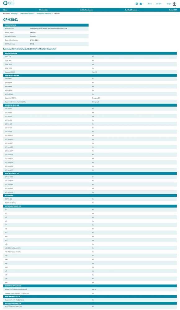 根据GCF官网信息,型号为“CPH2841”的设备已获得批准,申请厂商为“广东欧珀移动通信有限公司”。该认证的参考编号为“13622”,获批日期为3月17日。
