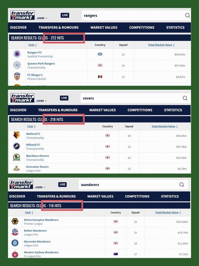 由于搜索结果包含了名称相同的一线队、各级青年队和女子球队,进行手动剔除后,可得出结论:德转收录的球队中,以“Rovers”为名的流浪者队有177支;以“Rangers”为名的流浪者队有171支,以“Wanderers”为名的流浪者队有89支。