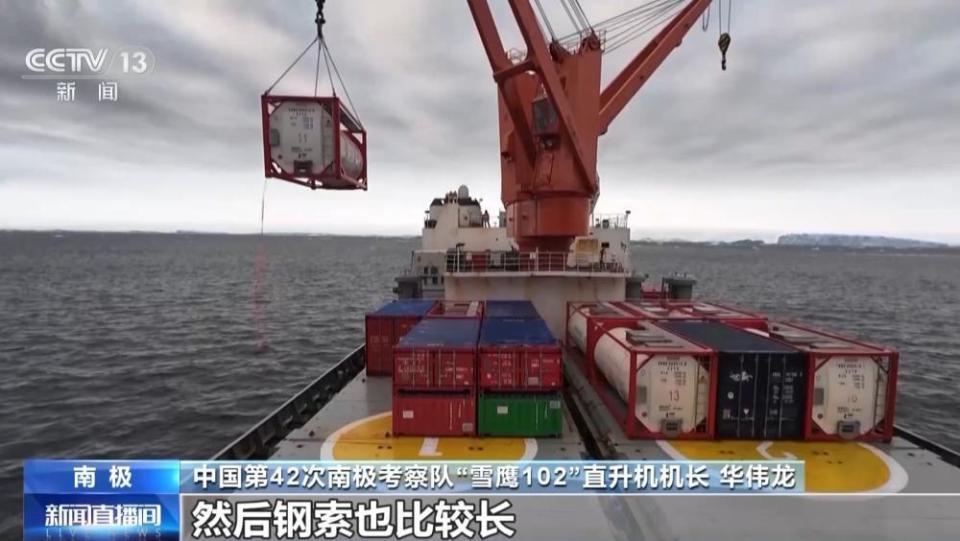 在吊挂作业的最后阶段,“雪鹰102”直升机通过两趟飞行,将在澳大利亚采购的蔬菜、水果等食品补给吊运到站上。