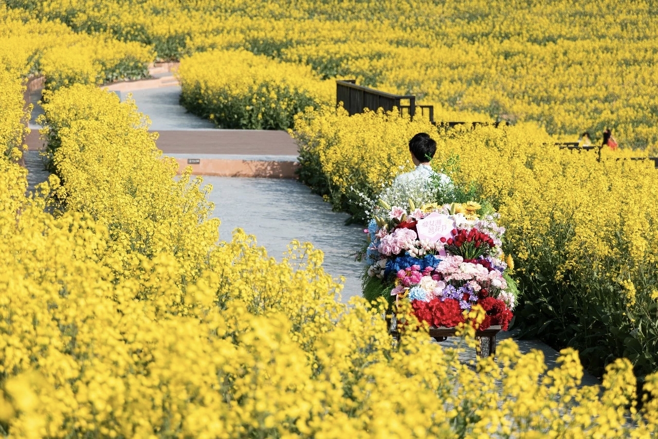 除了萌趣十足的人偶巡游,婺女洲的三月被金色油菜花所装点。层层叠叠的梯田上,油菜花如金色的海洋般铺展,与白墙黛瓦民居交相辉映,构成一幅绝美的江南春景图。游客乘摇橹船,穿梭于花海与水巷之间,感受“舟行碧波上,人在画中游”的诗意。夜幕降临,璀璨的烟花在抱玉塔上空绽放,将春夜的浪漫推向高潮。