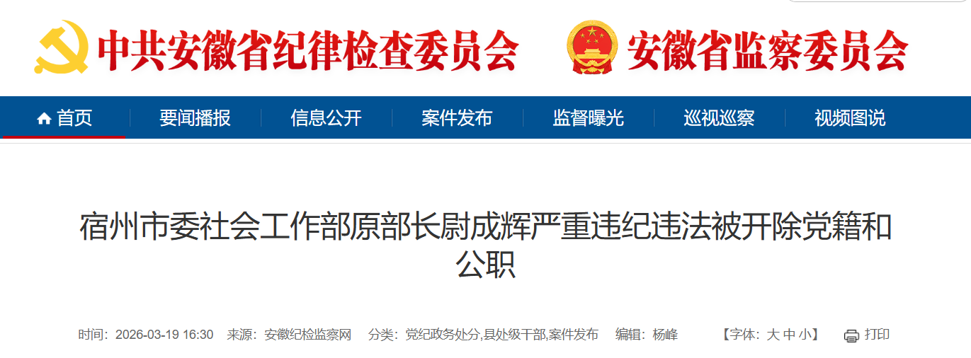 据安徽纪检监察网3月19日消息,日前,经中共宿州市委批准,宿州市纪委监委对宿州市委社会工作部原部长尉成辉严重违纪违法问题进行了立案审查调查。