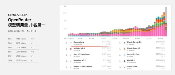 【CNMO科技消息】3月19日,小米集团创始人雷军通过社交媒体宣布,公司旗下的大模型MiMo-V2-Pro在全球最大的大模型API聚合平台OpenRouter上,先后登顶日榜与周榜榜首。