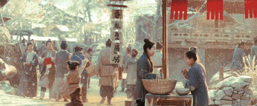 故事的前半部分发生在林安镇西固巷,画面充满东方美学韵味:小镇雪景、留白构图、雨夜灯笼、窗外黑影……宛如一幅徐徐展开的水墨画卷。演员妆容摒弃了古偶剧里泛滥的“塑料磨皮滤镜”,女主角以一脸小雀斑的粗粝质感,展现人物扎根泥土的真实感。