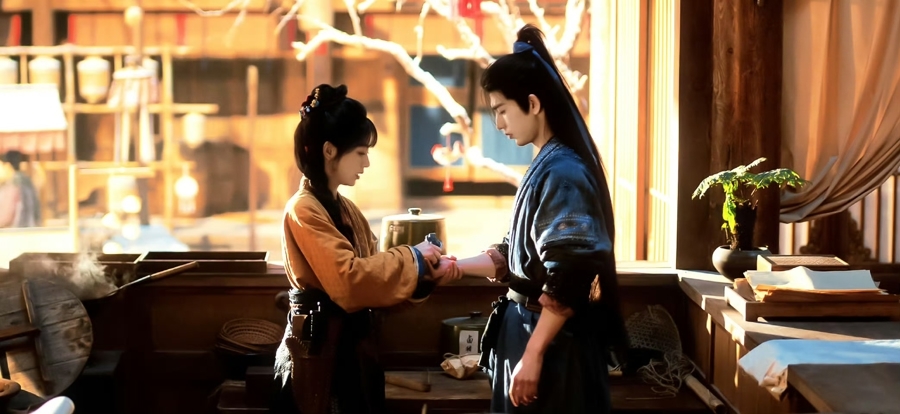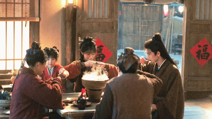 画面与妆容皆为剧情服务,是看点。《逐玉》用大量笔墨铺展出一幅微缩却鲜活的古代市井图景:屠户争抢生意时的斤斤计较、亲戚为祖宅撕破脸皮、邻里因孩童打闹吵上街头……剧中亦不乏温情细节:除夕夜灶台咕嘟冒泡,亲朋围坐火锅笑语喧哗;陈皮糖的甜意,既是孩童初遇的友谊见证,也承载着男主对女主的美好记忆;古典婚礼中的同牢礼、合卺酒、拜高堂等仪轨细致呈现,考究动人。这些琐碎日常,构成了最真实的人间底色,正如樊长玉所言:“原来人在高兴时,心里是会响的——就像灶台里的火,噼里啪啦;就像冬日里的暖阳,刚好照在身上。”这些铺垫看似琐碎,却为女主为爱人冒险、为故乡复仇的执念奠定了可信基础,更是在常被诟病悬浮的古偶剧中难得的用心用力。