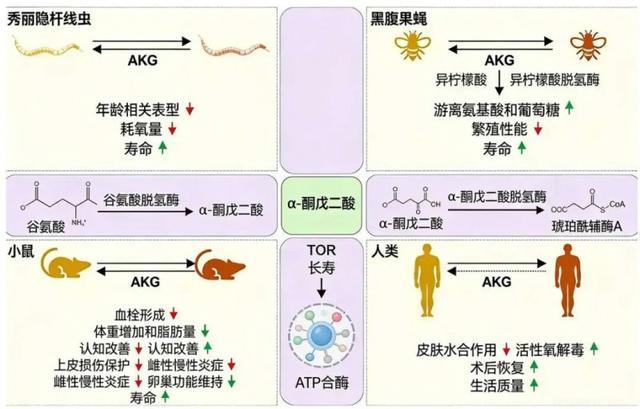大量基础实验研究表明,AKG在不同模式生物中均展现出显著的寿命延长及健康改善作用,其调控机制具有高度保守性。
