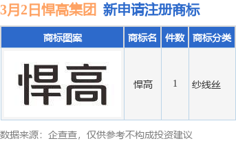 证券之星消息,根据天眼查APP数据显示,近日悍高集团股份有限公司新提交“悍高”商标注册申请。商标申请详情如下: