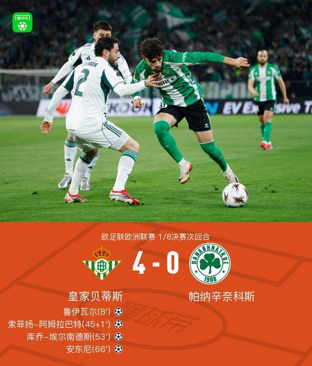 北京时间3月20日欧足联欧洲联赛 1/8决赛次回合,皇家贝蒂斯对阵帕纳辛奈科斯。皇家贝蒂斯鲁伊瓦尔破门,索菲扬-阿姆拉巴特破门,库乔-埃尔南德斯破门,安东尼破门。最终比分皇家贝蒂斯 4-0 帕纳辛奈科斯。两回合总比分皇家贝蒂斯4-1帕纳辛奈科斯。