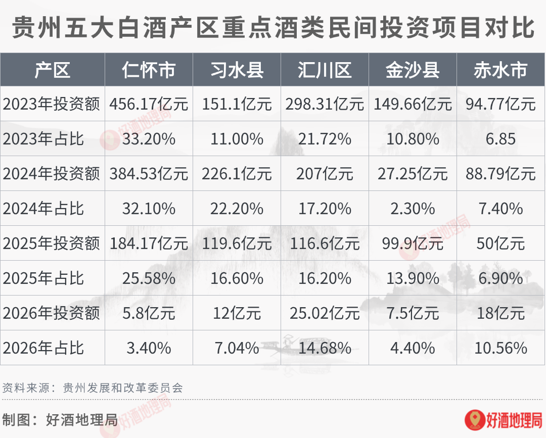 2026年的变迁更为引人注目。珍酒庄园投资22.7亿蓄势待发,赤水投入18亿仍在角逐产能,黔南产区异军突起,以41.81亿的投资,占比达到惊人的24.6%。