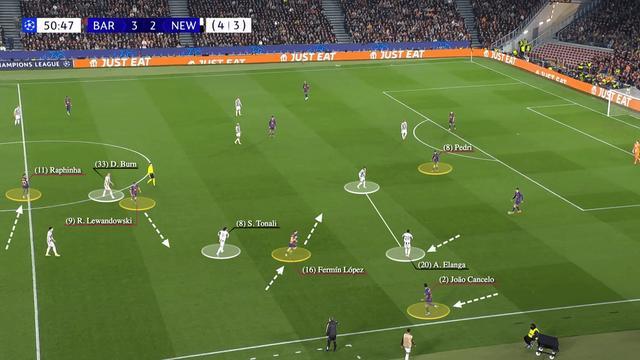 周三对阵纽卡一役,巴萨也采用了同款战术拆解对手防线。