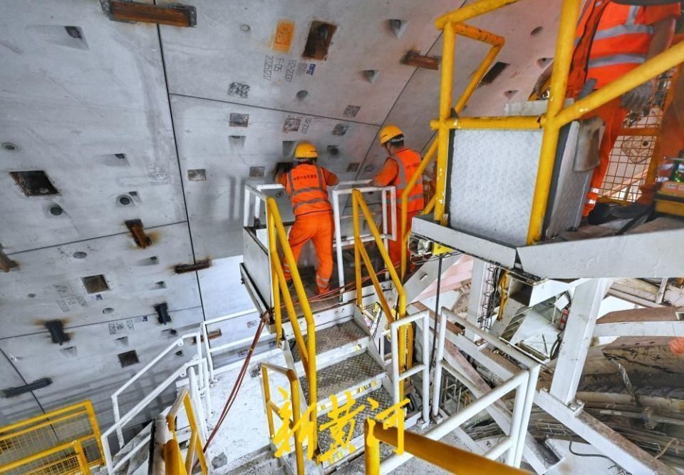 在盾构机接收阶段,隧道上方覆土仅9.36米,不足一倍洞径,且该段地层以粉细砂为主,透水性大,承压水头高,易因土体扰动失稳引发涌水涌砂。项目团队超前开展地质研究,精准掌控浅覆土掘进参数。通过土体预加固、同步注双液浆、增强接收环管片拉紧等措施,严格控制掘进参数,实时监测地表及结构变形,最终成功攻克浅覆土施工,实现盾构机平稳接收。