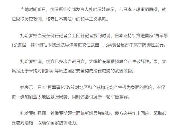 就在日本接收“战斧”导弹后,当地时间3月18日,俄外交部发言人扎哈罗娃直接对日本发出警告。她在记者会上说,日本如果不打算重蹈覆辙,就应该老老实实地汲取历史教训,遵守日本宪法中的和平主义条款。