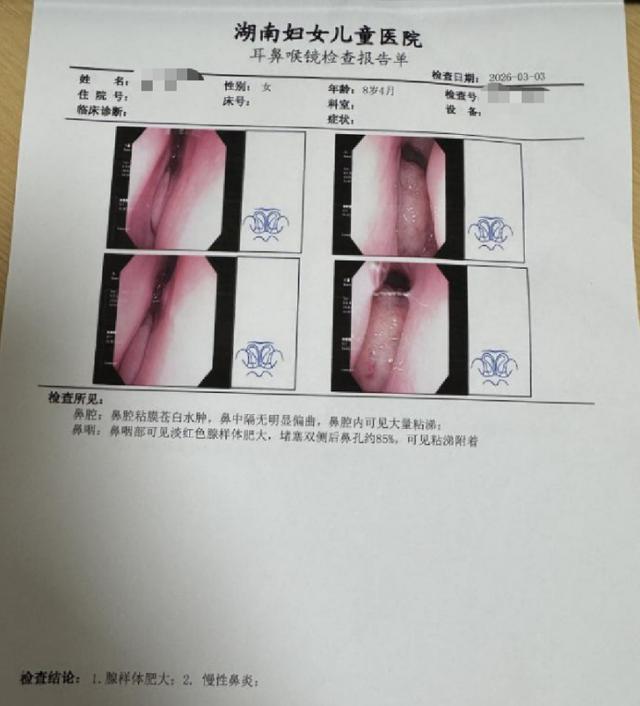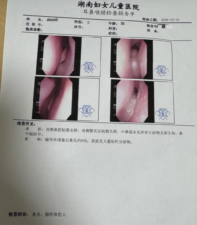 我接过检查报告,情况确实不容乐观:耳鼻喉镜检查显示,腺样体肥大堵塞后鼻孔高达95%!