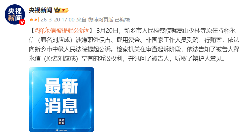 3月20日,新乡市人民检察院就嵩山少林寺原住持释永信(原名刘应成)涉嫌职务侵占、挪用资金、非国家工作人员受贿、行贿案,依法向新乡市中级人民法院提起公诉。检察机关在审查起诉阶段,依法告知了被告人释永信(原名刘应成)享有的诉讼权利,并讯问了被告人,听取了辩护人意见。