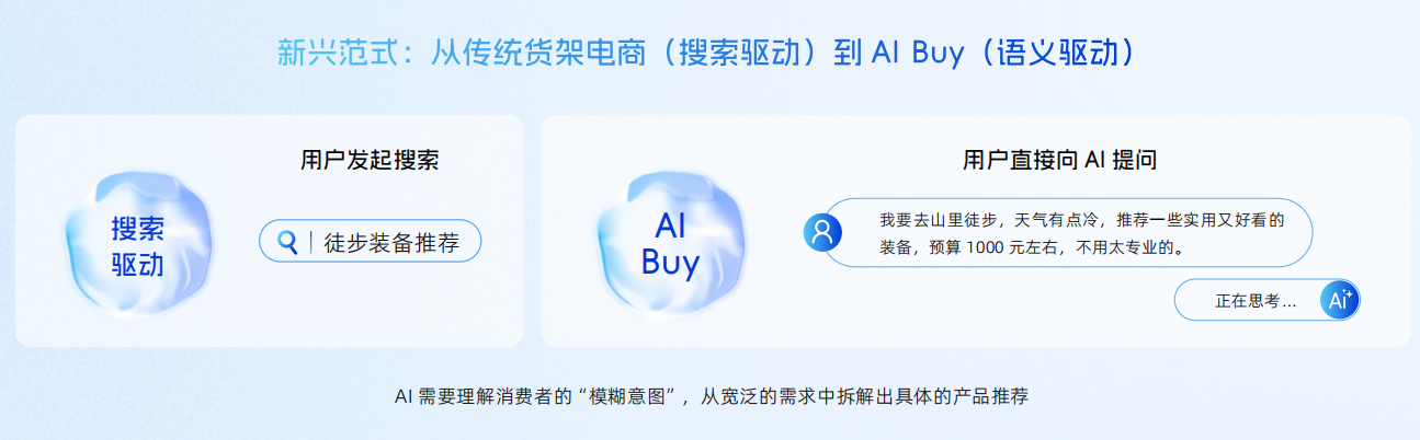 阿里妈妈联合贝恩公司推出的《2026经营趋势&未来商业奖案例大赏》指出,AI Buy(语义驱动)正作为新兴购物范式登场。相比于搜索驱动型的传统购物范式,生成式AI正成为消费决策的重要辅助。用户不再用关键词发起精准搜索,而是用自然语言向AI提出场景化、复杂化需求,AI会拆解“模糊意图“并输出定制化推荐。这种变化意味着,当下正从搜索时代逐步跨向意图时代,品牌竞争转向对“语义占领+知识资产”核心能力的比拼。