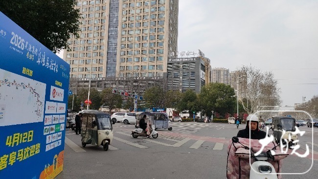 3月20日,记者在阜城颍淮大道和西湖路交叉路口看到,路边已树起有关2026阜阳马拉松大型标识牌,上面有线路图以及其他包含“阜马”元素的提示信息,不时有路人在此打卡拍照。