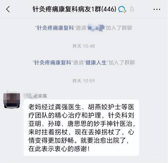 近日,在邵东市中医医院针灸疼痛康复科400余人的病友微信群内,患者家属向医院发来致谢信息,对全体医护人员的精心救治与悉心照料表示衷心感谢。入院时,77岁的周奶奶需要依靠助行器艰难行走;如今,老人已能稳健独立行走,脸上满是舒心笑容。