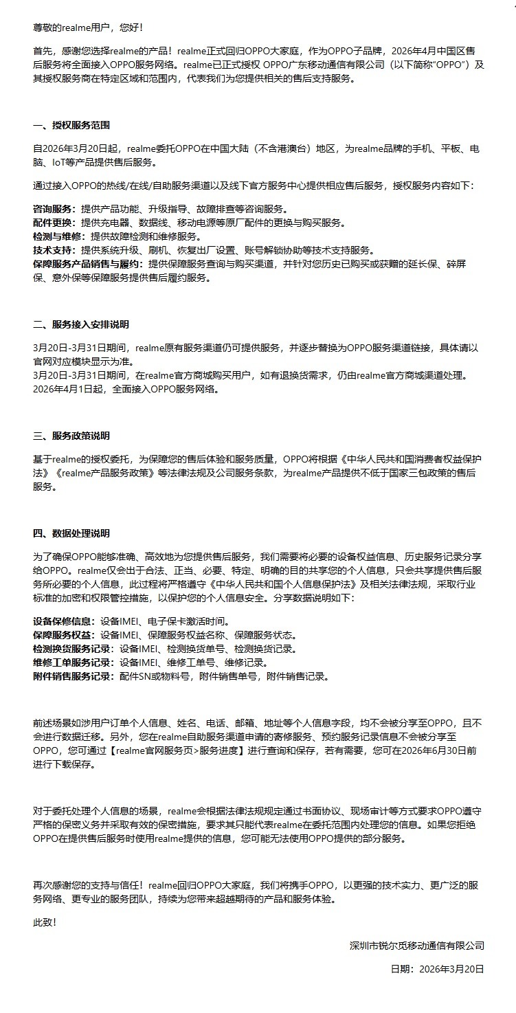 公告显示,从2026年3月20日起,realme已正式委托OPPO在中国大陆地区提供售后支持,服务内容涵盖产品咨询、配件更换、故障检测与维修、系统升级及技术支持等多个环节,基本实现全流程服务覆盖。同时,相关保障服务与权益履约也将纳入OPPO体系中执行。