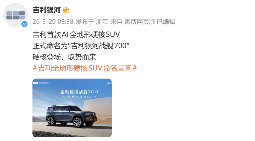 3月20日,吉利银河官宣,吉利银河首款AI全地形硬核SUV正式定名为——吉利银河战舰700。据了解,这一命名采用“用户共创” 方式,源自全球用户征名活动。3月16日,吉利银河公开首款科技硬核SUV全球征名TOP10高频词,包括战舰、卫士、磐石、星际、浩瀚、安全、方舟、护卫者、征途、S900,最终确定新车定名为吉利银河战舰700。