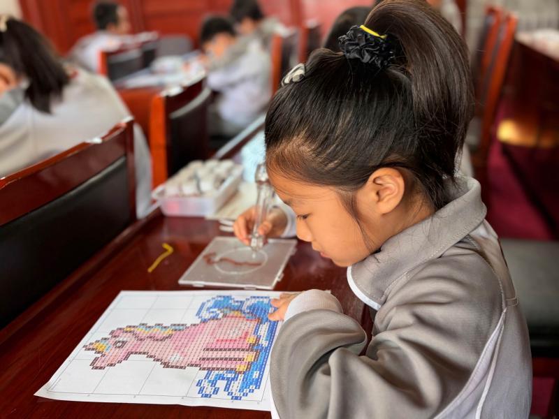 在创意拼豆手作环节,同学们凝神聚力、巧手拼搭,将传统脊兽的造型特点、色彩搭配复刻于指尖。在一拼一搭之间,同学们沉浸式感受古人的审美意趣与造物智慧,学会观察传统建筑的美学细节,提升色彩搭配、造型塑造的美育素养;在动手创作的过程中,团队协作能力、动手实践能力也得到充分锻炼,让世遗文化不再是书本上的文字,而是触手可及的创意作品。