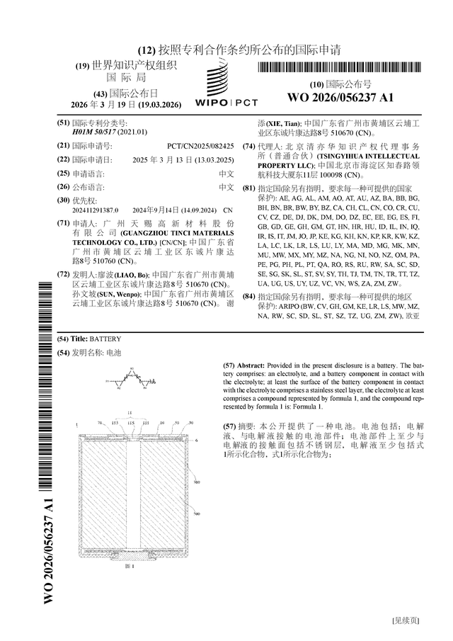 证券之星消息,根据企查查数据显示天赐材料(002709)公布了一项国际专利申请,专利名为“电池”,专利申请号为PCT/CN2025/082425,国际公布日为2026年3月19日。