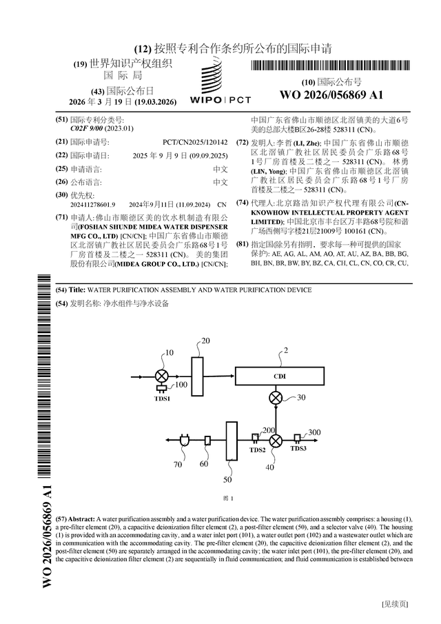证券之星消息,根据企查查数据显示美的集团(000333)公布了一项国际专利申请,专利名为“净水组件与净水设备”,专利申请号为PCT/CN2025/120142,国际公布日为2026年3月19日。