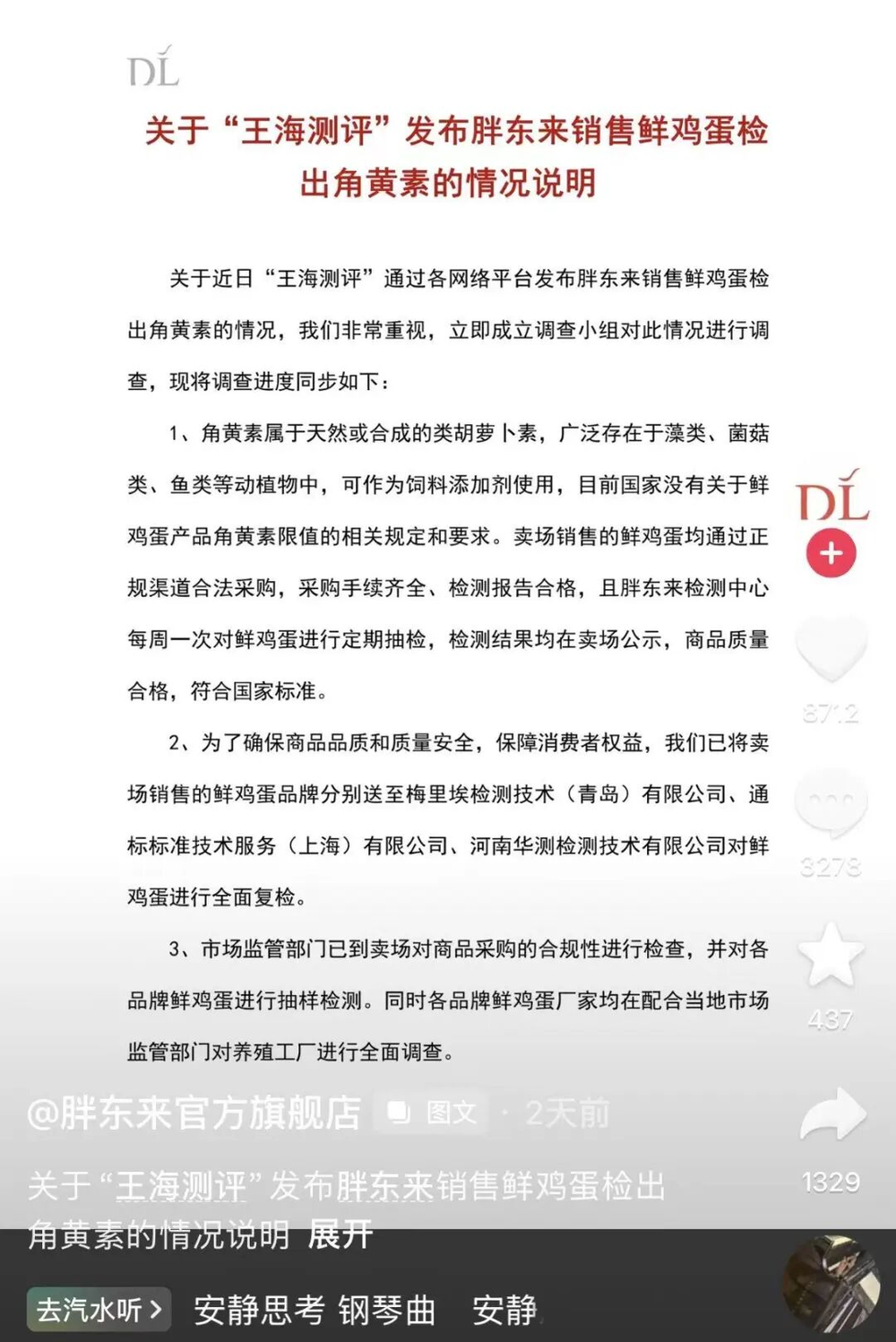 最近,“王海测评”称送检了胖东来卖的十款鸡蛋,都有角黄素。其中送检的,还有号称“蛋中贵族”的黄天鹅品牌。