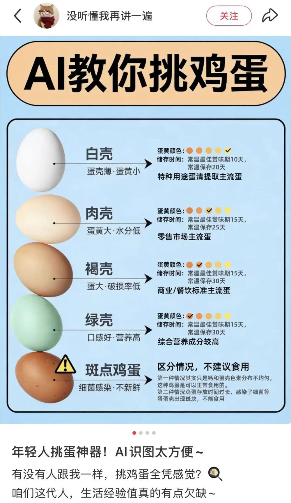 去年年末,“蛋神”@爱吃蛋在抖音横空出世,9天关注人数破400万。根据他的分享,肉眼看起来沙皮的鸡蛋不太好,表面很光滑、把蛋放到手机摄像头上能看到很多小点的蛋比较不错,能看到花纹的是内膜发育不完全,时间长了容易变质。