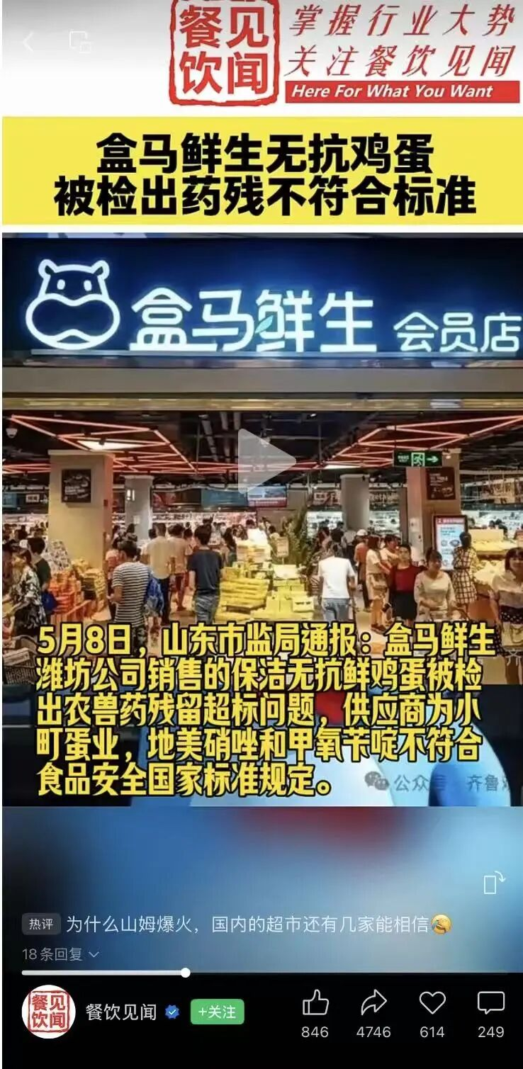 早在2025年5月,山东省市场监管局通报,盒马鲜生潍坊公司销售的一批次“保洁无抗鲜鸡蛋”中,检出了地美硝唑和甲氧苄啶超标。其中,地美硝唑——这种具有致癌、致畸、致突变风险的兽药,国家标准明确规定不得在动物性食品中检出。