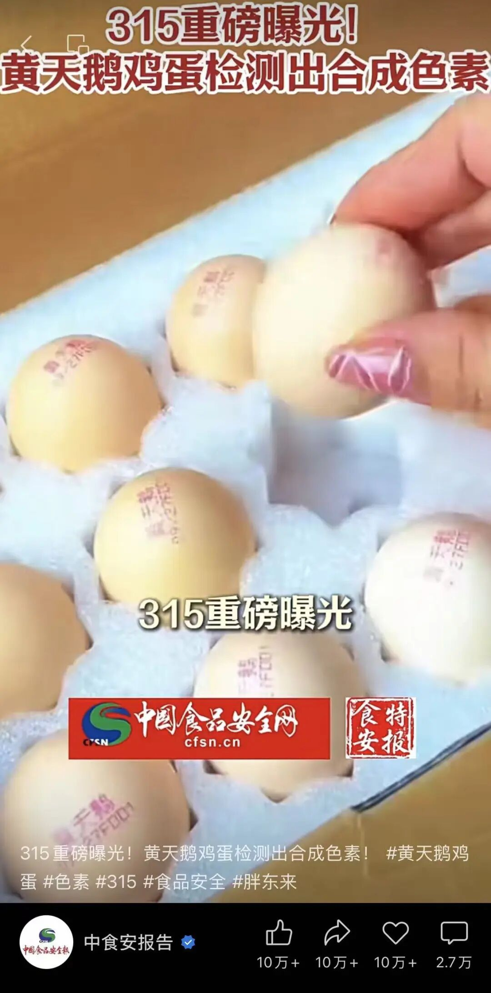 在这场博弈中,流量最先捕捉到了“名气最大”的那一个。“中国食品安全报社”旗下“中食安报告”账号跟进了此事,从十款被检鸡蛋中精准锁定了黄天鹅,发布了黄天鹅鸡蛋被检出“合成色素”的短视频。