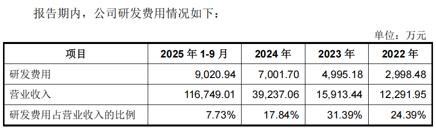 报告期内,宇树科技研发费用分别为2,998.48万元、4,995.18万元、7,001.70万元、9,020.94万元,呈持续增长态势。不过,随着营收的快速增长,研发费用在营收当中的占比称下滑趋势,分别为24.39%、31.39%、17.84%、7.73%。