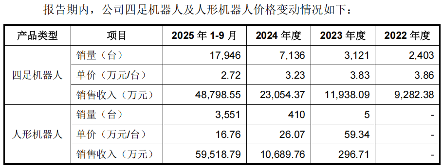从具体的产品销售情况来看,报告期内,宇树科技的四组机器人销量分别为2,403台、3,121台、7,136台、17,946台,销量呈现高速增长态势,但是单价也在逐步下滑,从2022年的3.86万元下滑至2025年1-9月的2.72万元。