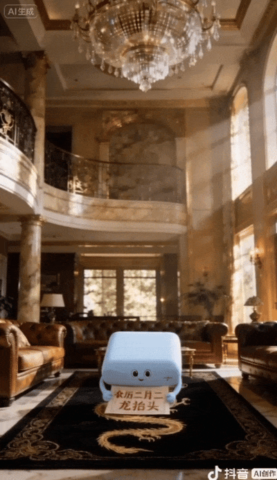 截至目前,话题#龙抬头开运的仪式感 累计播放量超4000万,短剧同款特效#AI万物龙抬头 上线24小时内,已有3377人使用,百篇商家投稿,播放量超千万。