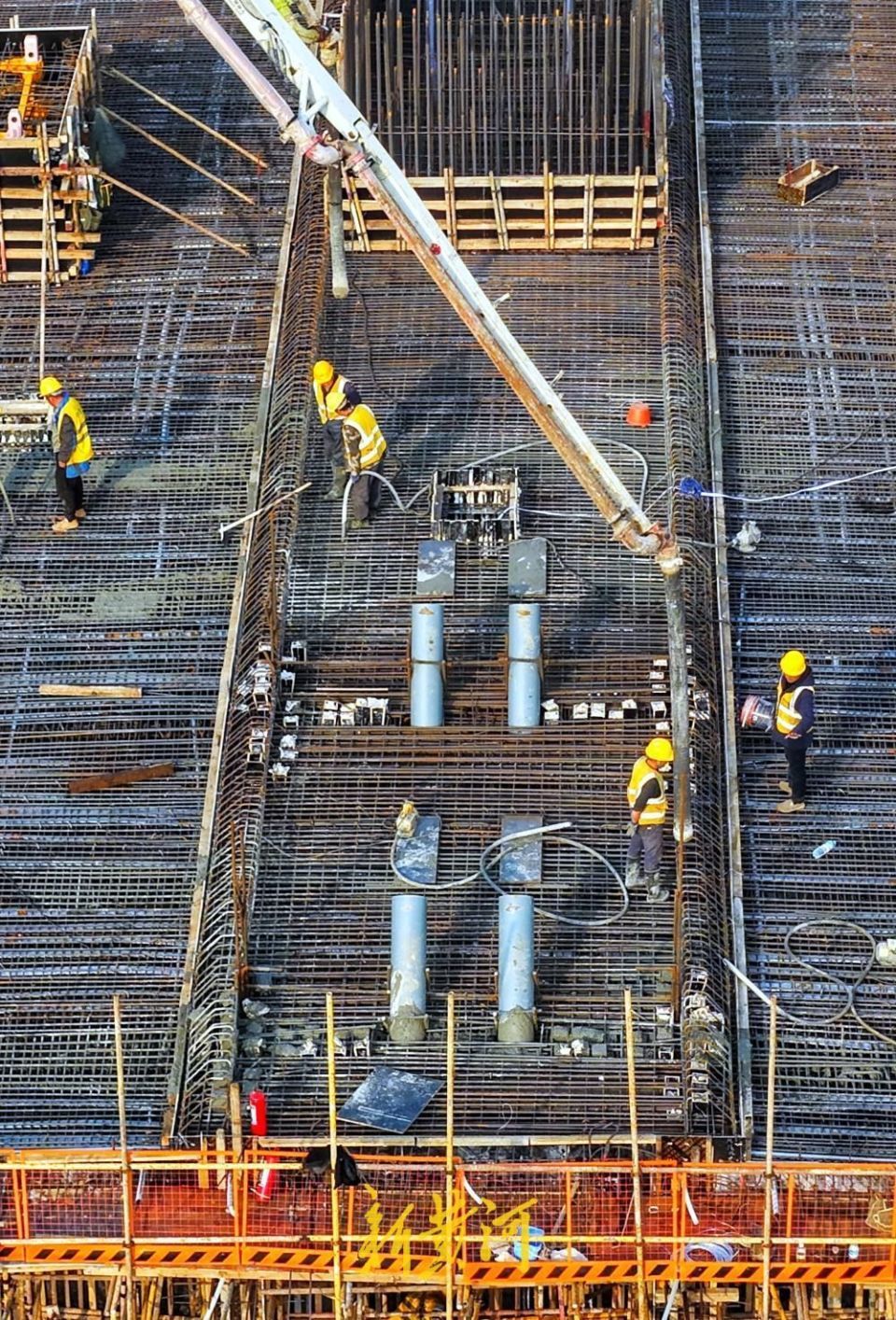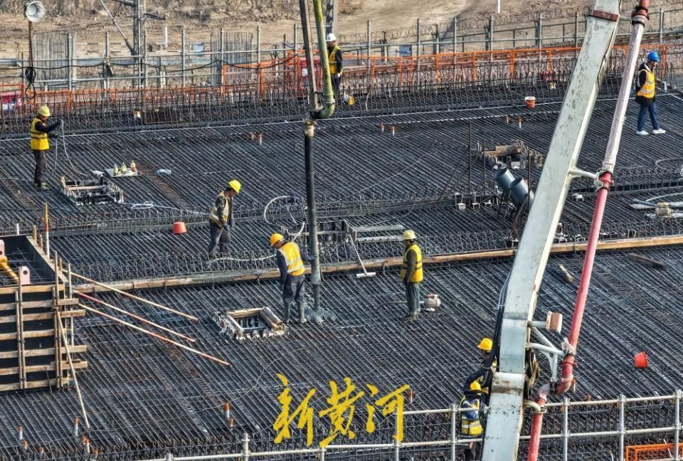 作为济南西部重点路网工程,腊山河西路北延主桥为单塔斜拉转体桥,上跨铁路、河流与市政道路,技术难度高、施工管控严。本次浇筑的A节段箱梁长47.3米,宽33.8米,混凝土1950m立方米,钢筋570吨,体量创同类型转体桥之最,浇筑采用2台汽车泵作业,严格执行纵向分段、水平分层、对称均匀浇筑施工工艺,实现了箱梁一次浇筑成型、内实外美,以技术创新守住质量底线。