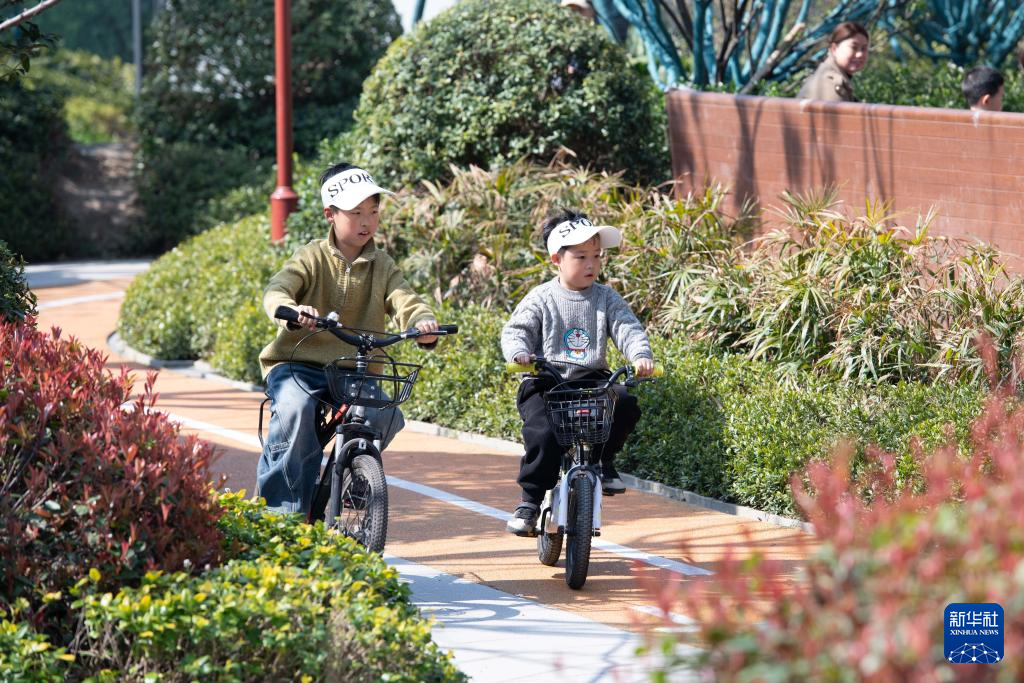 3月11日,在安徽省合肥市瑶海区的火车口袋公园,小朋友在骑行。