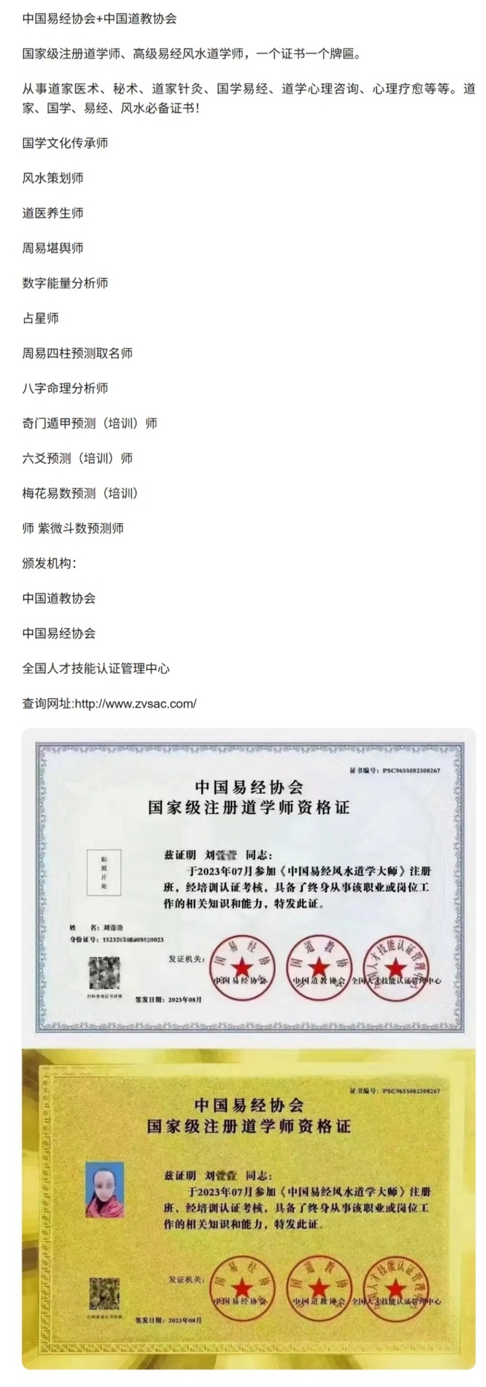 此外,澎湃新闻记者通过搜索工具查询发现,以“中国易经协会+中国道教协会”名义出现的所谓“国家级注册道学师、高级易经风水道学师”等人才技能认证广告在多个网络信息平台上出现,还提到“一个证书一个牌匾”等认证项目。