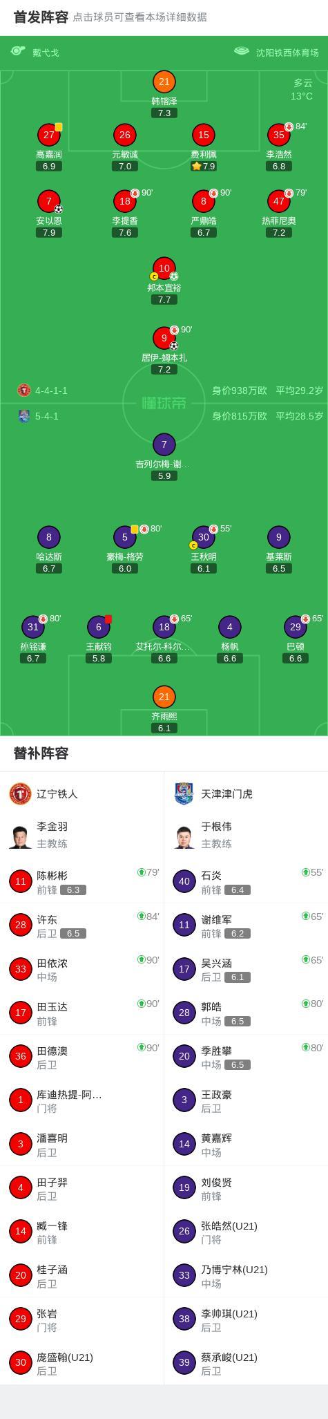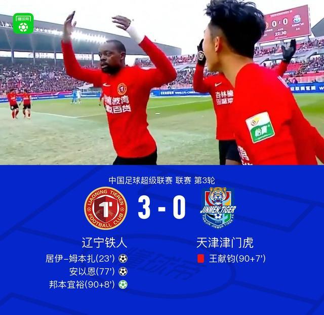 北京时间3月21日15:30,中超第3轮继续进行,辽宁铁人坐镇沈阳铁西体育场迎战天津津门虎,本场主裁判为戴弋戈,VAR裁判为黄翼。上半场,王秋明开场失良机,随后姆本扎攻入辽宁铁人中超首球。下半场,安以恩兜射再下一城;补时阶段,王献钧吃到红点套餐,邦本宜裕勺子点球破门。最终,铁人3-0完胜津门虎,迎中超首胜。