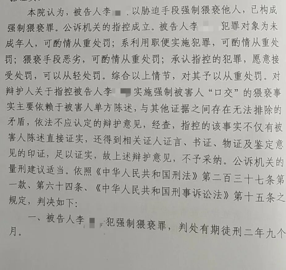 3月16日,霞浦县法院出具的《刑事判决书》提及,法院认为,李某以胁迫手段强制猥亵他人,已构成强制猥亵罪,公诉机关的指控成立。李某的犯罪对象为未成年人,可酌情从重处罚;其系利用职便实施犯罪,可酌情从重处罚;猥亵手段恶劣,可酌情从重处罚;承认指控的犯罪,愿意接受处罚,可从轻处罚。