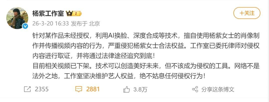 3月20日,杨紫工作室发文回应:针对某作品未经授权,利用AI换脸、深度合成等技术,擅自使用杨紫女士的肖像制作并传播视频内容的行为,严重侵犯杨紫女士合法权益。工作室已委托律师对侵权内容进行取证,并将通过法律途径追究到底!