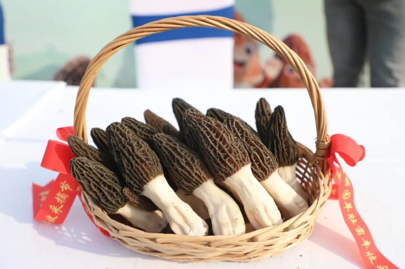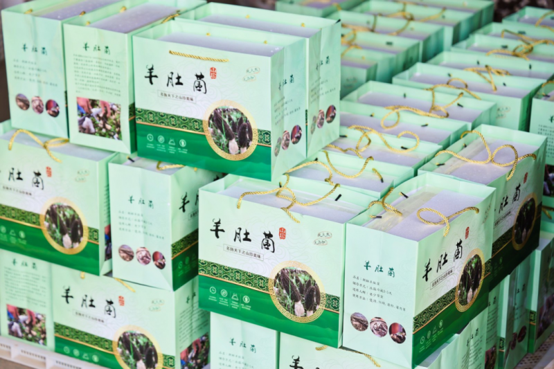 通过图文展板和实物陈列,系统介绍羊肚菌的形态特征、食用方法与养生功效。鲜品、干品、羊肚菌酱等产品集中亮相,让游客直观了解羊肚菌的不同产品类型。