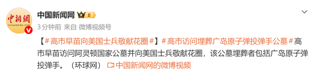 据环球网:高市早苗访问阿灵顿国家公墓并向美国士兵敬献花圈,该公墓埋葬者包括广岛原子弹投弹手。