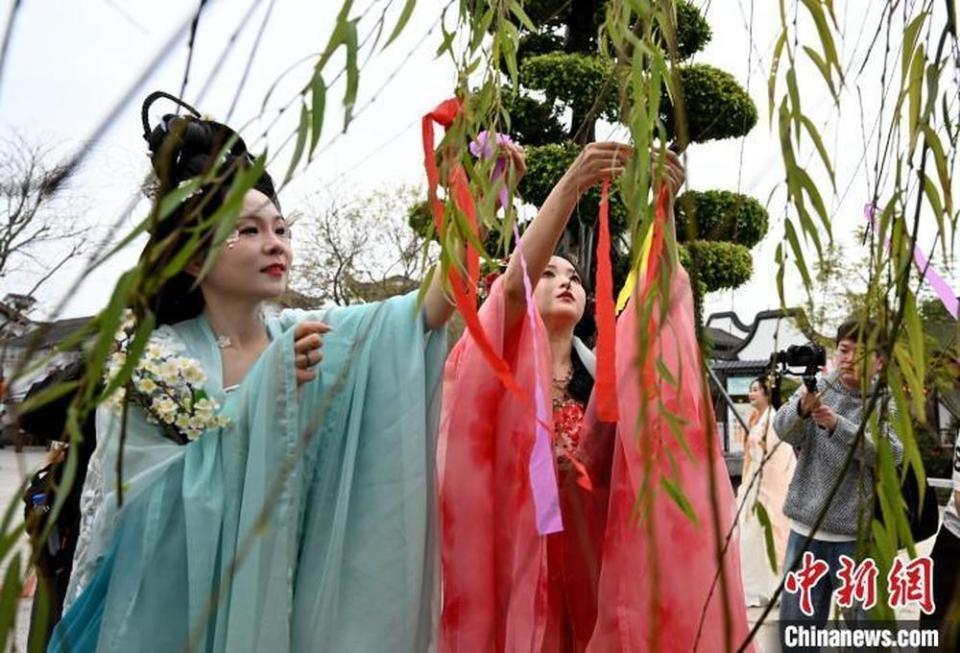 资料图:图为披彩赏红仪式,身穿汉服的青年在树木系上祈福的五彩绸带。中新社记者 吕明 摄