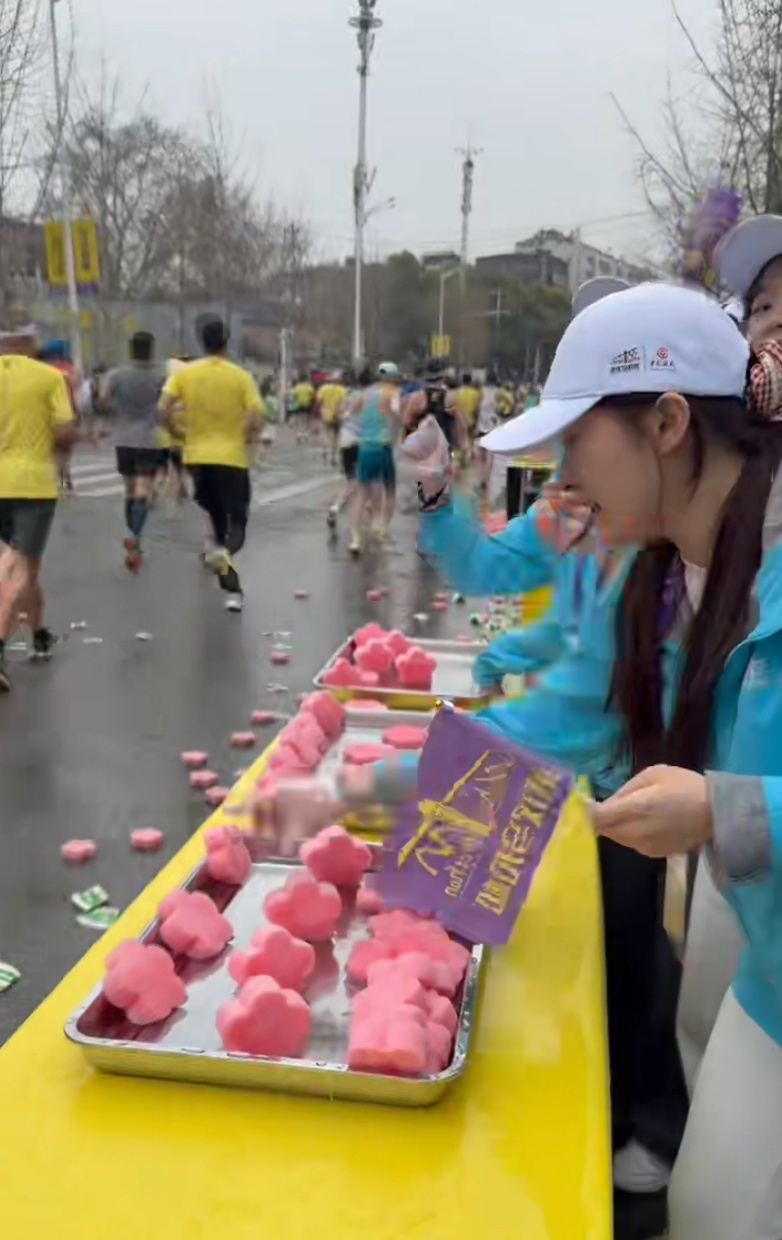 九派新闻注意到,跑道旁还有志愿者专门摆放、提供粉色的樱花状吸水海绵,一位志愿者表示,这是给选手降温、擦汗,保持体力的“擦擦”。