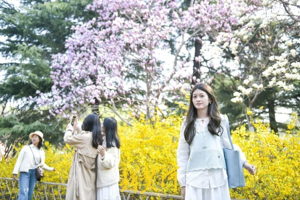 走进公园,白色与紫色的玉兰花亭亭玉立,黄色的连翘灿若金锦,白色的紫叶李和樱花如云似雪,怒放的鲜花倒映在碧蓝的泉水中,与池中嬉戏的锦鲤相映成趣,构成一幅灵动的春日画卷。