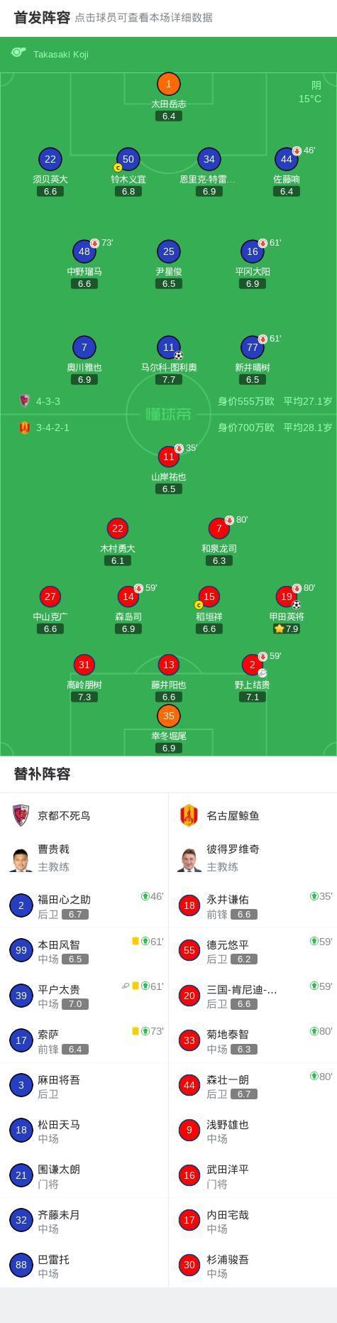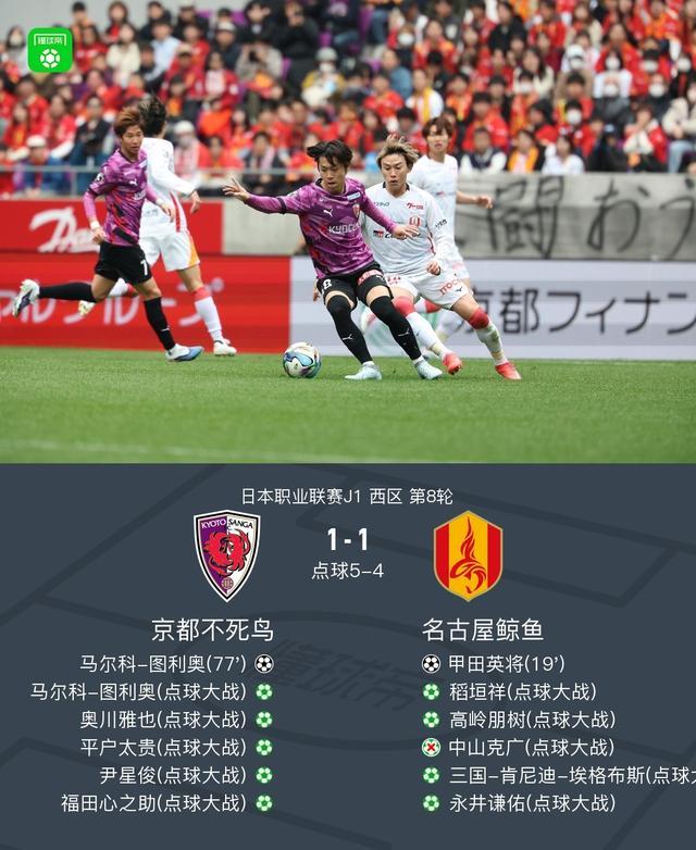 北京时间3月22日日本职业联赛J1 西区 第8轮,京都不死鸟主场对阵名古屋鲸鱼。上半场甲田英将传中,球直接转进球门。下半场平户太贵传球,图利奥头球破门。点球大战中山克广失点。最终京都不死鸟总比分6-5战胜名古屋鲸鱼