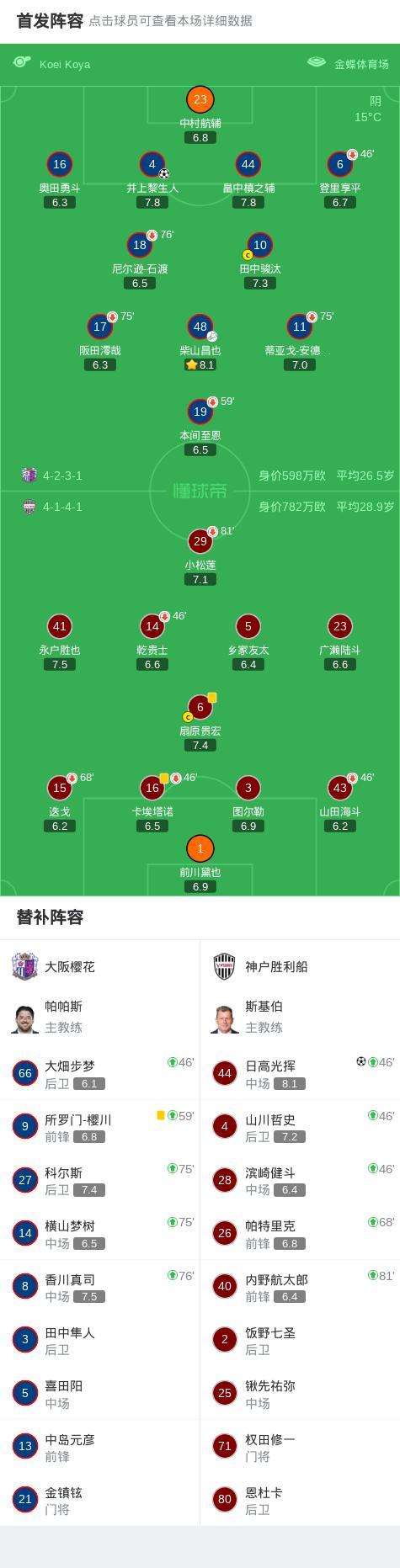 第12分钟,柴山昌也角球开到前点,井上黎生人头球破门,大阪樱花1-0