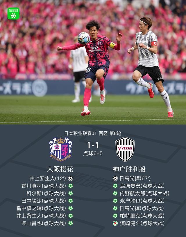 北京时间3月22日日本职业联赛J1 西区 第8轮,大阪樱花主场对阵神户胜利船。大阪樱花井上黎生人破门。神户胜利船日高光挥破门。最终比分大阪樱花 7-6 神户胜利船。