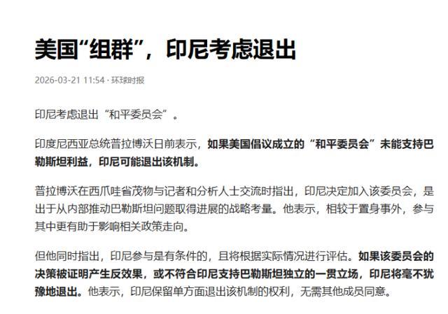 近日,印度尼西亚总统普拉博沃公开表示,印尼可能退出这个“和平委员会”。他讲得很清楚,印尼当初决定加入,是出于战略考量,想从内部推动巴勒斯坦问题取得进展。