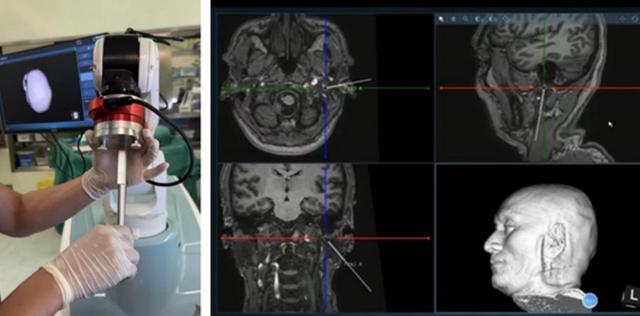 “面神经走行深、解剖结构复杂,周围毗邻重要血管神经,传统操作对经验依赖较强,风险控制难度较大。”杨靓教授介绍,“通过机器人导航与三维影像重建,我们实现了穿刺路径的精准规划与实时引导,使操作更加安全、稳定、可控。”